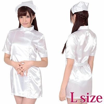 男女問わず、誰もが一度は憧れるナース服コスチューム(L)。キラキラとした純白生地の光沢感がとってもキレイ!セクシーなミニスカートのワンピースとナースキャップのコスプレセットです。フロントはボタン式で下まで開きます。※Mサイズ(b15245)、LLサイズ(b18128)あります。