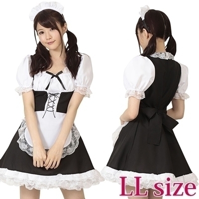 裾と袖、エプロンに施されたレースが可愛らしいメイド服コスプレ(LL)。白×黒カラーで清楚なメイドさんをアピール!胸元やバックリボン、フロントの編み上げ等、とっても豪華なデザインに仕上げたメイド服コスチュームです。※Lサイズ(b18111)あります。