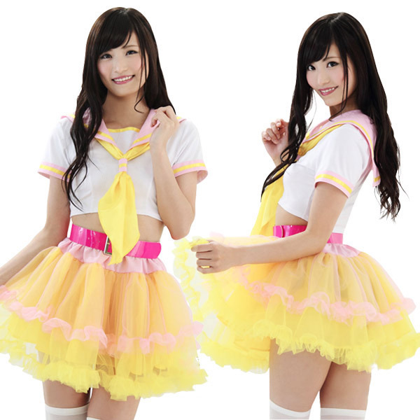 ●ピンク&イエローのパステルカラー●差し色の鮮やかピンクな太ベルト●トップスはおヘソが見える短め丈●ふんわり広がるパニエスカート●統一感のあるアイドル風セット。