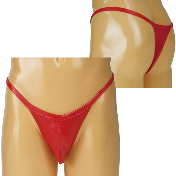 ツヤのある赤エナメル素材で魅せるオシャレメンズのTバックショーツ「メンズ エナメルフロントフルシームTバック レッド」。